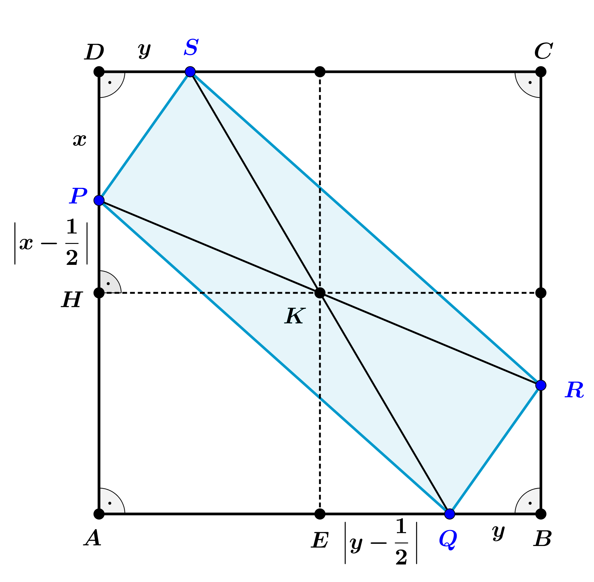 Az \(\displaystyle AB\) és \(\displaystyle AD\) oldalak felezőpontjait \(\displaystyle E\)-vel, illetve \(\displaystyle H\)-val jelölve \(\displaystyle PH=\mid{x-\frac{1}{2}}\mid\) és \(\displaystyle QE=\mid{y-\frac{1}{2}}\mid\).