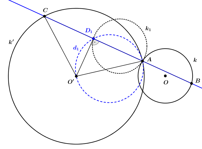 Például, mivel a \(\displaystyle d_1\) kör biztosan érinti a \(\displaystyle k'\) kört (az \(\displaystyle A\) pontban), és ha érintené a \(\displaystyle k_1\)-et is, akkor az csak az \(\displaystyle A\) pontban volna lehetséges, de akkor érintenie kellene a \(\displaystyle k_1\)-nek az \(\displaystyle A\)-ra vonatkozó tükörképét, vagyis a \(\displaystyle k\) kört. Ez azonban azt jelentené, hogy \(\displaystyle k\) és \(\displaystyle k'\) is érintik egymást \(\displaystyle A\)-ban, ez viszont ellentmond annak a feltételnek, hogy \(\displaystyle k\) és \(\displaystyle k'\) két pontban metszik egymást. Ezért \(\displaystyle d_1\)-nek és \(\displaystyle k'\)-nek az \(\displaystyle A\) ponton kívül még van egy közös pontja, ez éppen \(\displaystyle D_1\).