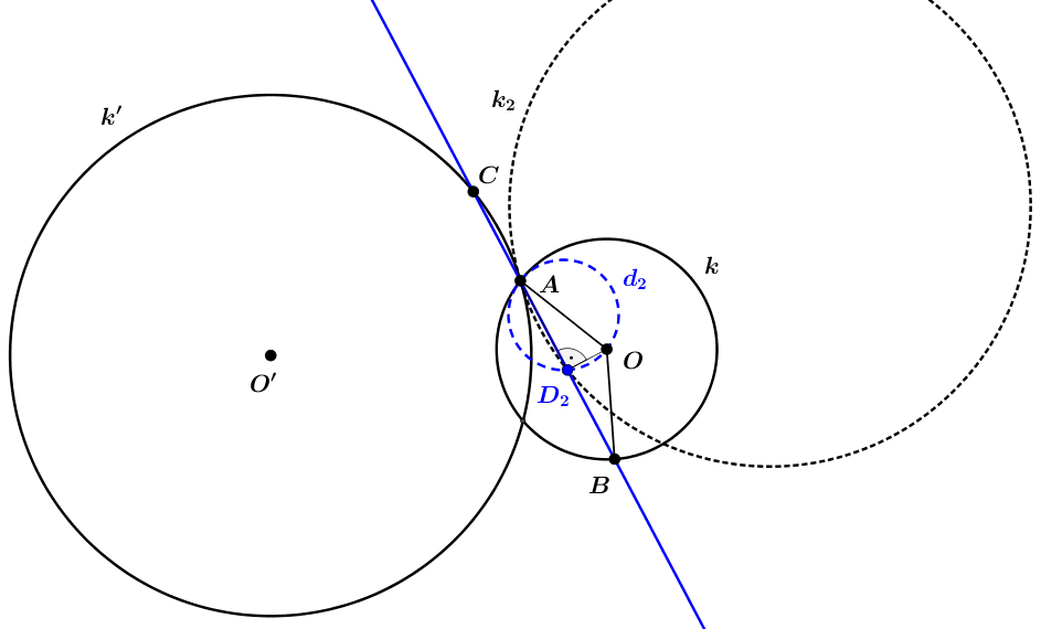 A szerkesztés módját tekintve teljesen hasonló módon járhatunk el a b) esetben is, de ekkor a \(\displaystyle k'\) körnek az \(\displaystyle A\)-ra vonatkozó tükörképe a \(\displaystyle k_2\) kör, ennek a körnek és az \(\displaystyle AO\) mint átmérő fölé rajzolt \(\displaystyle d_2\) Thalész-körnek a metszéspontja a \(\displaystyle D_2\), és a szerkesztés miatt egyrészt \(\displaystyle D_2\) felezi az \(\displaystyle AB\) szakaszt, másrészt \(\displaystyle AC=AD_2=BD_2\) (2. ábra).