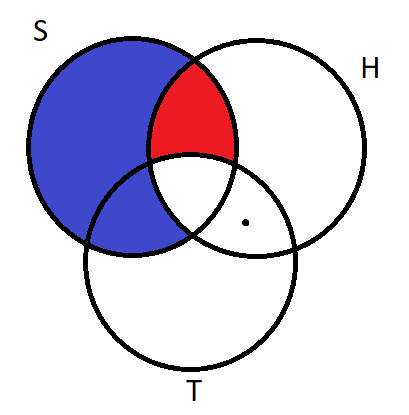 Az a feltétel, hogy minden hétfejű sárkány tüzet okád, azt jelenti, hogy a pirossal jelölt rész (\(\displaystyle S\cap H \setminus T\)) üres. Az pedig, hogy nem minden hétfejű tüzet okádó lény sárkány azt jelenti, hogy \(\displaystyle H\cap T\setminus S\ne \emptyset\) (az ábrán egy pont jelöli, hogy ebben a részben legalább egy elem található). Ha minden sárkány hétfejű lenne, az azt jelentené, hogy \(\displaystyle S\setminus H\) (az ábrán kékkel jelölt rész) üres. Ekkor viszont az összes sárkány \(\displaystyle S\cap H\cap T\) eleme lenne, így mivel \(\displaystyle H\cap T\setminus S\)-ben is van legalább egy lény, több tűzokádó lenne, mint sárkány, ellentétben a megadott feltétellel.