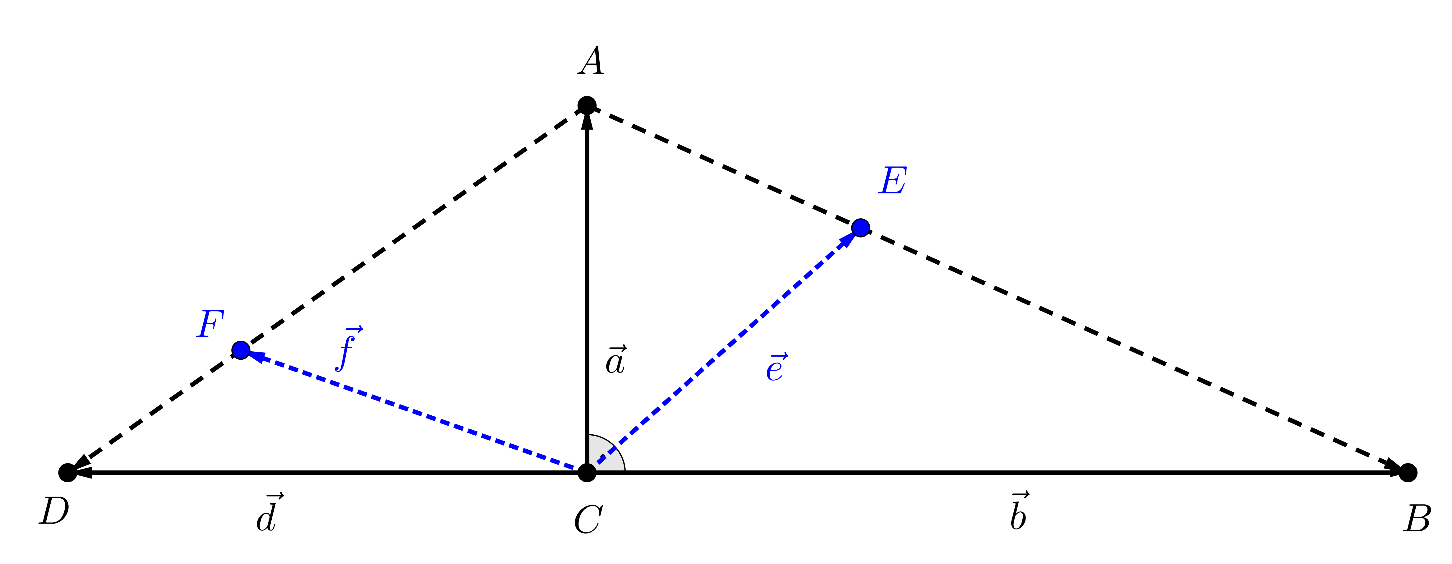2. megoldás. Illesszük össze a két derékszögű háromszöget úgy, hogy az egységnyi befogójuk azonos legyen, ezzel a másik két befogó egyenese is ugyanaz az egyenes lesz. Tekintsük a következő ábrát, amelyen a \(\displaystyle C\) pontból az \(\displaystyle A, B, D, E, F\) pontokba rendre az \(\displaystyle \overrightarrow{a}, \overrightarrow{b}, \overrightarrow{d}, \overrightarrow{e}, \overrightarrow{f}\) vektorokat indítottuk, ahol az \(\displaystyle AB\) átfogó \(\displaystyle A\)-hoz közelebbi harmadolópontja \(\displaystyle E\) és a másik háromszög \(\displaystyle AD\) átfogójának \(\displaystyle A\)-tól távolabbi harmadolópontja \(\displaystyle F\).