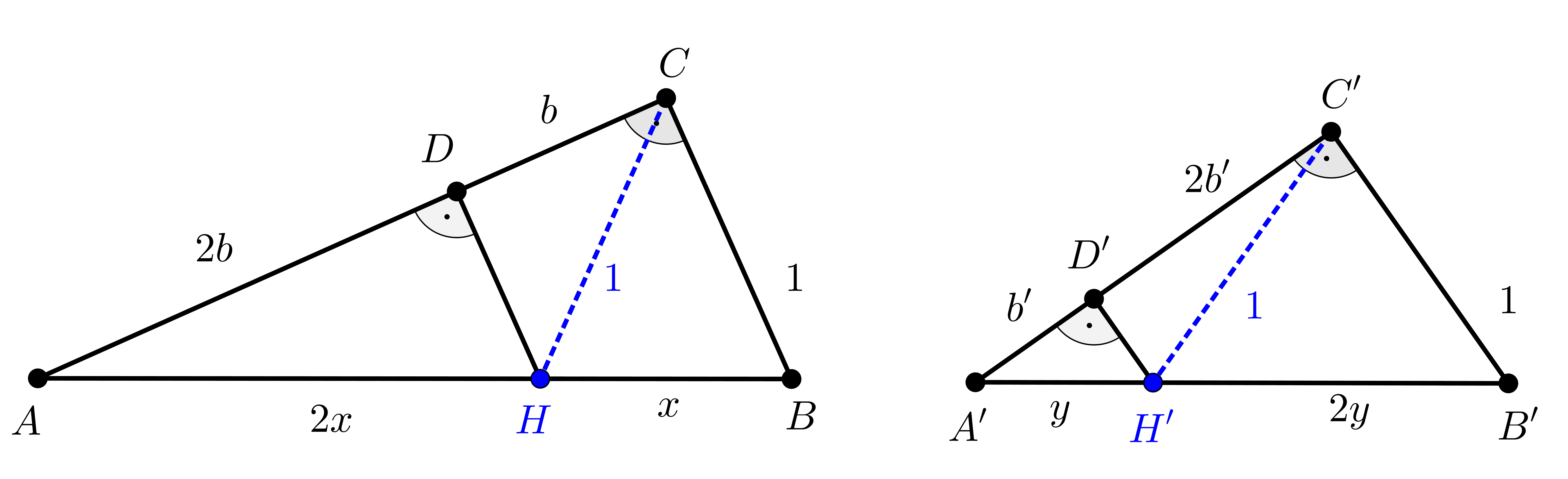 A feltételeknek megfelelően az \(\displaystyle ABC\) háromszögben az \(\displaystyle AB\) átfogó \(\displaystyle B\)-hez közelebbi harmadolópontja \(\displaystyle H\), míg az \(\displaystyle A'B'C'\) háromszögben az \(\displaystyle A'B'\) átfogó \(\displaystyle A'\)-höz közelebbi harmadolópontja \(\displaystyle H'\).
