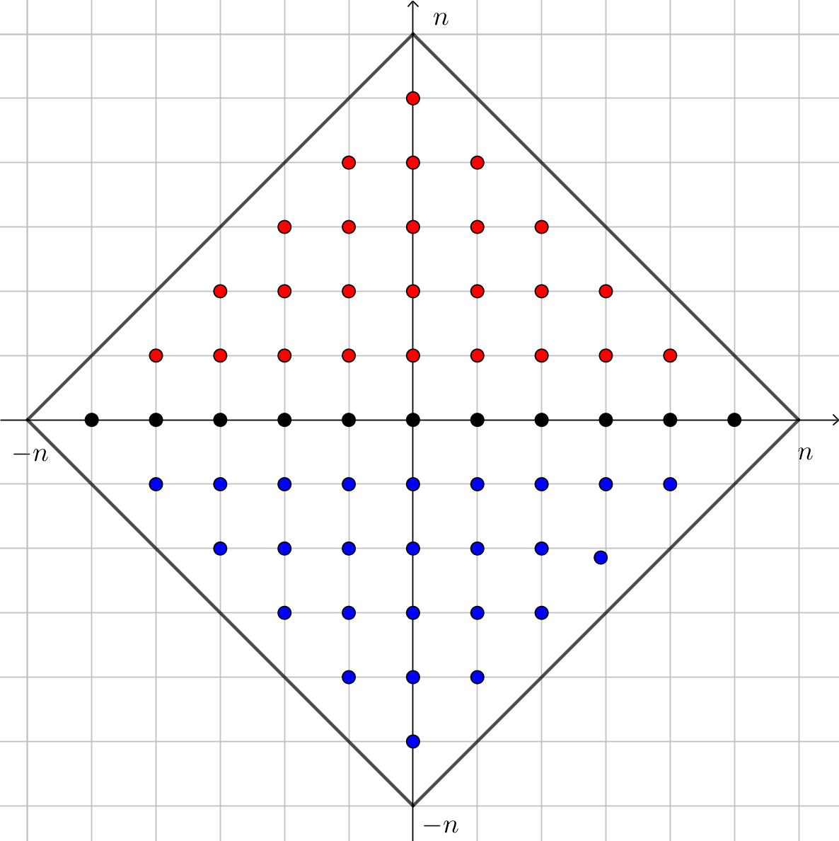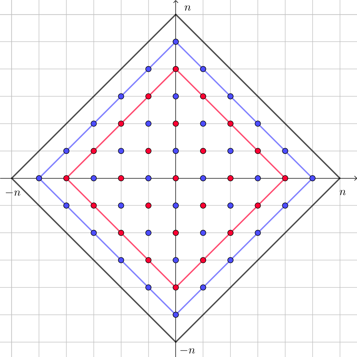 A megoldások két ,,ferde rácsnégyzet'' rácspontjai lesznek, az egyikben kékkel, a másikban pirossal jelöltük a rácspontokat. A kék rácsnégyzet oldalain éppen \(\displaystyle n\) darab rácspont, a piros oldalain pedig \(\displaystyle n-1\) darab rácspont van, így a rácspontok, és így a megfelelő számpárok száma összesen: