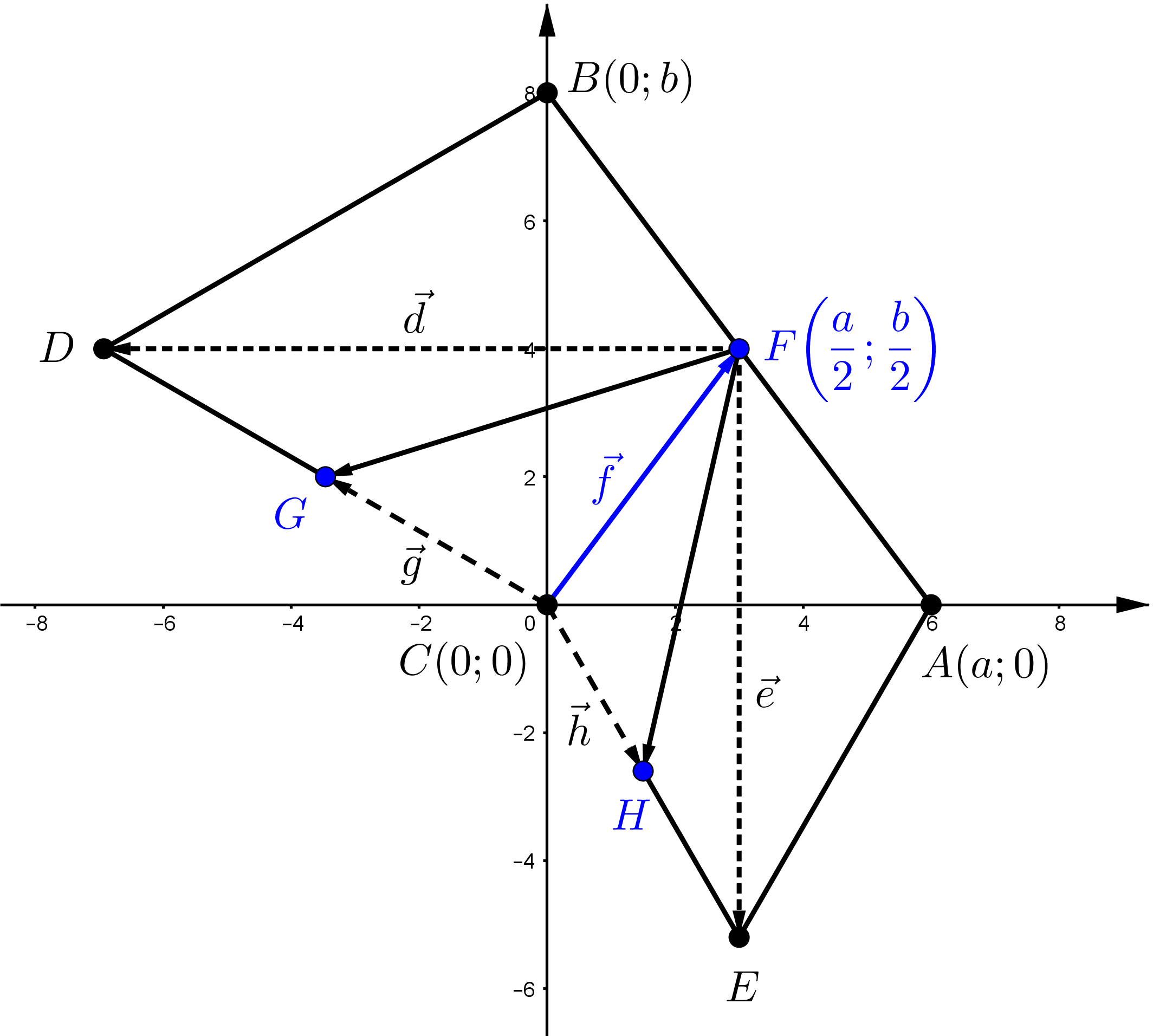 A vektorösszeadás szabálya szerint \(\displaystyle \overrightarrow{f}+\overrightarrow{d}=\overrightarrow{CD}\) és \(\displaystyle \overrightarrow{f}+\overrightarrow{e}=\overrightarrow{CE}\), így, mivel \(\displaystyle G\), illetve \(\displaystyle H\) a \(\displaystyle CD\), illetve \(\displaystyle CE\) oldalak felezőpontja, ezért a \(\displaystyle \overrightarrow{CG}=\overrightarrow{g}\) és \(\displaystyle \overrightarrow{CH}=\overrightarrow{h}\) vektorokra teljesül, hogy: