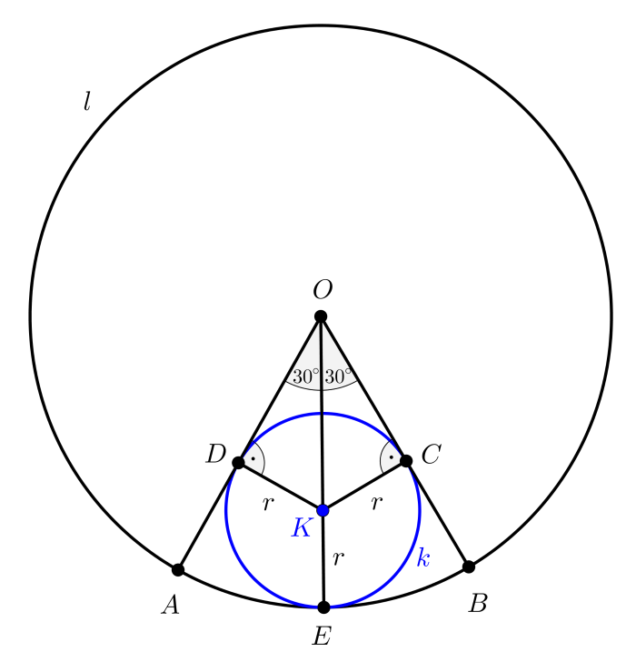 Az \(\displaystyle r\) sugarú, \(\displaystyle K\) középpontú \(\displaystyle k\) kör az \(\displaystyle OAB\) körcikk \(\displaystyle OB, OA\) sugarait rendre a \(\displaystyle C, D\) pontban, az \(\displaystyle AB\) ívet az \(\displaystyle E\) pontban érinti. A \(\displaystyle KCO\) és \(\displaystyle KDO\) egybevágó derékszögű háromszögek, amelyekben \(\displaystyle KOC\sphericalangle=KOD\sphericalangle=30^{\circ}\), emiatt mindkét háromszögben a \(\displaystyle 30^{\circ}\)-os szöggel szemben levő befogó fele a közös \(\displaystyle KO\) átfogónak, amelyből \(\displaystyle KO=2r\) következik. Mivel \(\displaystyle KE=r\) is igaz, ezért azt kapjuk, hogy