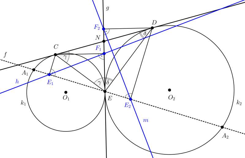 C. 1663. A \(\displaystyle k_1\) és \(\displaystyle k_2\) körök az \(\displaystyle E\) pontban kívülről érintik egymást. Az \(\displaystyle f\) és \(\displaystyle g\) egyenesek áthaladnak az \(\displaystyle E\) ponton. A két kör egyik közös külső érintője a \(\displaystyle k_1\), \(\displaystyle k_2\) köröket rendre a \(\displaystyle C\), \(\displaystyle D\) pontokban érinti. Bocsássunk merőlegeseket a \(\displaystyle C\) pontból az \(\displaystyle f\), \(\displaystyle g\) egyenesekre és kössük össze a merőlegesek talppontjait, így kapjuk a \(\displaystyle h\) egyenest. Hasonlóképpen adódik a \(\displaystyle D\) pontból kiindulva az \(\displaystyle m\) egyenes. Bizonyítsuk be, hogy \(\displaystyle h\) és \(\displaystyle m\) merőleges egymásra.
