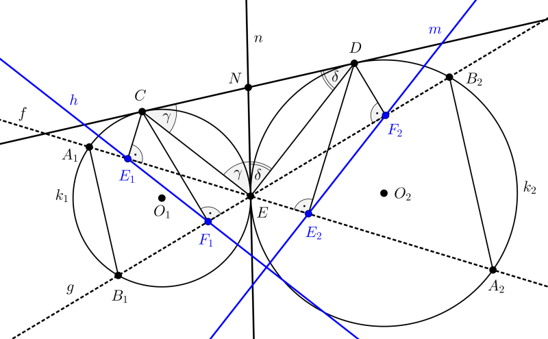 Először azt bizonyítjuk, hogy a \(\displaystyle CE\) és \(\displaystyle DE\) egyenesek merőlegesek egymásra. Az érintőszakaszok hosszának egyenlősége miatt a \(\displaystyle k_1\) körre vonatkozóan \(\displaystyle NC=NE\), tehát az \(\displaystyle NCE\) háromszög egyenlő szárú, a \(\displaystyle k_2\) kör esetén pedig \(\displaystyle ND=NE\), azaz az \(\displaystyle NDE\) háromszög is egyenlő szárú. A szakaszok hosszának egyenlősége tranzitív tulajdonság, ezért