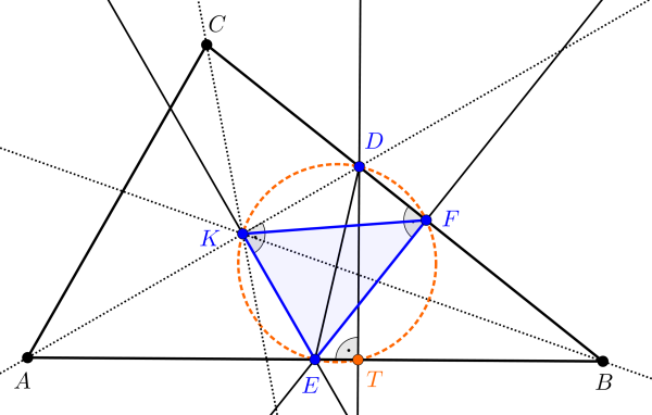 C. 1666. Az \(\displaystyle ABC\) hegyesszögű háromszög \(\displaystyle A\) pontból induló belső szögfelezőjének metszéspontja a \(\displaystyle B\)-ből induló belső szögfelezővel, valamint a \(\displaystyle BC\) oldallal \(\displaystyle K\), illetve \(\displaystyle D\). Az \(\displaystyle A\) pontból induló belső szögfelező metszéspontja a \(\displaystyle B\)-ből induló belső szögfelezővel, valamint a \(\displaystyle BC\) oldallal \(\displaystyle K\), illetve \(\displaystyle D\). Az \(\displaystyle AD\) szögfelezőre a \(\displaystyle K\) pontban állított merőleges az \(\displaystyle AB\) oldalt az \(\displaystyle E\) pontban metszi. Az \(\displaystyle E\) pontból a \(\displaystyle BC\)-re állított merőleges talppontja \(\displaystyle F\). Bocsássunk merőlegest a \(\displaystyle D\) pontból az \(\displaystyle AB\) egyenesre, a merőleges talppontja \(\displaystyle T\). Bizonyítsuk be, hogy \(\displaystyle T\) pont illeszkedik a \(\displaystyle KEF\) háromszög körülírt körére.