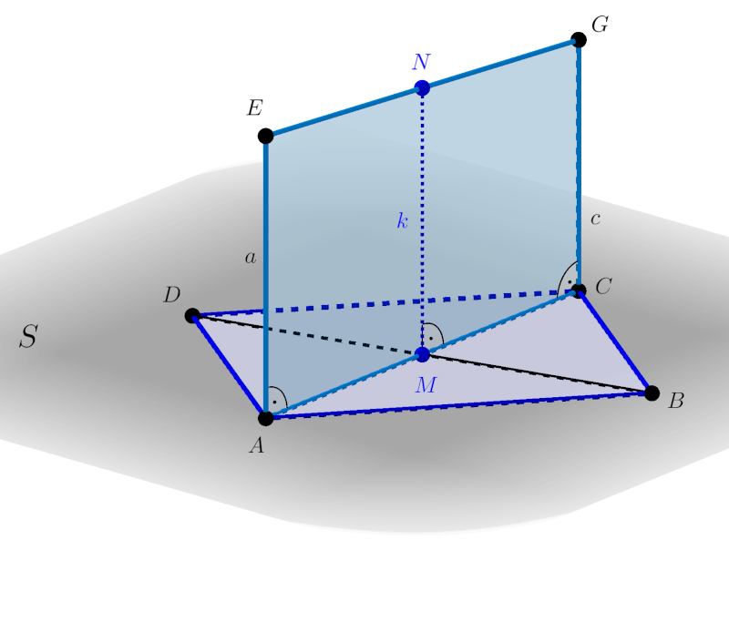 A \(\displaystyle CGEA\) négyszög derékszögű trapéz, amelynek alapjai az \(\displaystyle AE=a\) és \(\displaystyle CG=c\) szakaszok, a trapéz magassága az \(\displaystyle ABCD\) paralelogramma \(\displaystyle AC\) átlója. Az \(\displaystyle M\) felezi az \(\displaystyle AC\) átlót, ezért ha az \(\displaystyle M\) pontban az \(\displaystyle S\) síkra merőlegest állítunk, akkor a \(\displaystyle CGEA\) trapéz középvonalának egyenesét kapjuk, amelynek a trapéz belsejébe eső szakasza a trapéz \(\displaystyle MN=k\) középvonala. A \(\displaystyle CGEA\) trapéz \(\displaystyle T\) területe ezért: