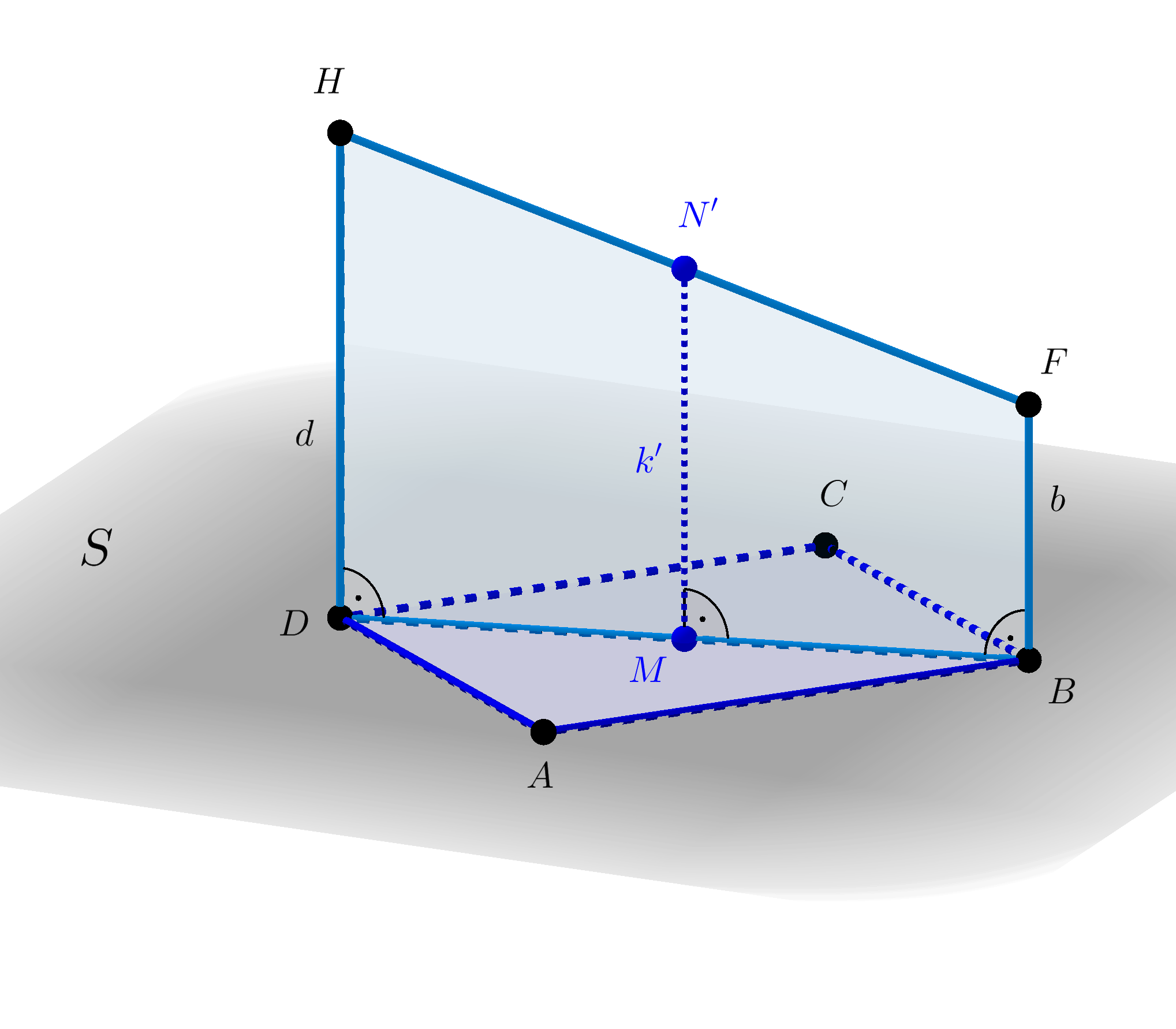 Az előzőekhez hasonlóan láthatjuk be, hogy a \(\displaystyle D, H, F, B\) pontok egy síkban vannak, továbbá \(\displaystyle DHFB\) derékszögű trapéz, amelynek magassága az \(\displaystyle ABCD\) paralelogramma \(\displaystyle BD\) átlója. A paralelogramma tulajdonsága miatt \(\displaystyle M\) a \(\displaystyle BD\) szakaszt is felezi, így ebben a pontban az \(\displaystyle S\) síkra merőlegest állítva kapjuk a trapéz középvonalának egyenesét, illetve az \(\displaystyle MN'=k'\) középvonalat. A \(\displaystyle DHFB\) trapéz \(\displaystyle t\) területe a \(\displaystyle BF=b\) és \(\displaystyle DH=d\) alapokkal kifejezve:
