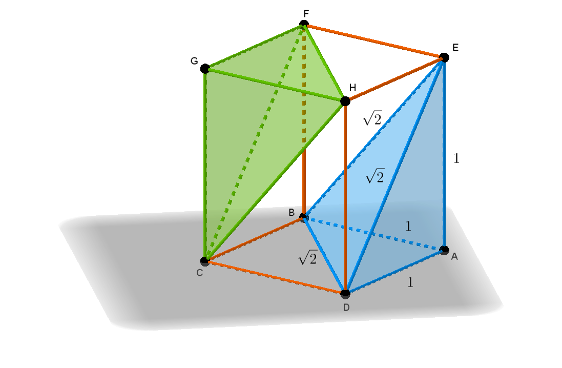 Megoldás. Az \(\displaystyle ABDE\) tetraéder páronként egymásra merőleges éleinek hossza \(\displaystyle AB=AD=AE=1\), a tetraéder többi élének hossza \(\displaystyle BD=DE=EB=\sqrt{2}\). Hasonlóképpen a \(\displaystyle GCFH\) tetraéder páronként merőleges élei \(\displaystyle GC=GF=GH=1\), illetve további élei \(\displaystyle HF=FC=CH=\sqrt{2}\). Tekintsük a következő ábrát.