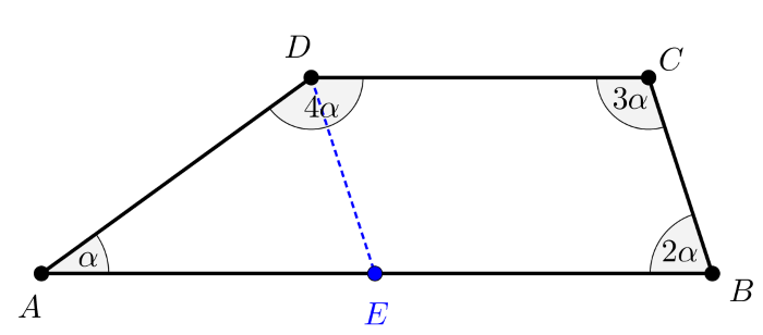 Az (1) eredményből következően \(\displaystyle 5\alpha=180^{\circ}\), tehát a négyszög \(\displaystyle BC\) és \(\displaystyle AD\) oldalán fekvő belső szögek összege mindkét esetben \(\displaystyle 180^{\circ}\). Ez pontosan azt jelenti, hogy a négyszög \(\displaystyle AB\) és \(\displaystyle DC\) oldalai párhuzamosak, vagyis az \(\displaystyle ABCD\) négyszög trapéz.