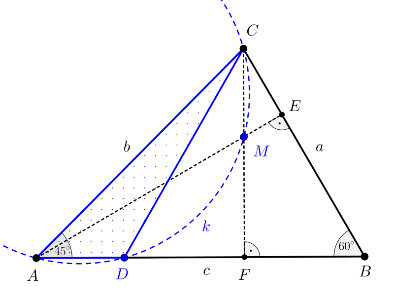 A \(\displaystyle k\) körre illeszkednek a \(\displaystyle C\), \(\displaystyle M\), \(\displaystyle D\), \(\displaystyle A\) pontok és a kerületi szögek tétele alapján a \(\displaystyle D\) pontból a \(\displaystyle CA=b\) húr ugyanakkora szögben látszik, mint az \(\displaystyle M\) pontból, ezért \(\displaystyle CDA\sphericalangle=120^{\circ}\), vagyis