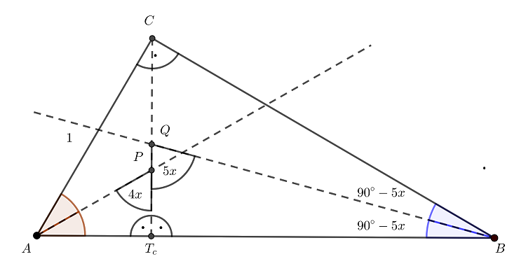 Tekintve, hogy \(\displaystyle AC< CB\), az is igaz, hogy \(\displaystyle CAB\sphericalangle >CBA\sphericalangle\), hiszen nagyobb oldallal szemközt nagyobb szög található. Az utóbbi egyenlőtlenségből viszont az következik, hogy az \(\displaystyle APT_c\) és \(\displaystyle BQT_c\) derékszögű háromszögek hegyesszögeire az alábbi összefüggések igazak (ahol \(\displaystyle AP\) és \(\displaystyle BQ\) a feladat szövegében szereplő szögfelezők):