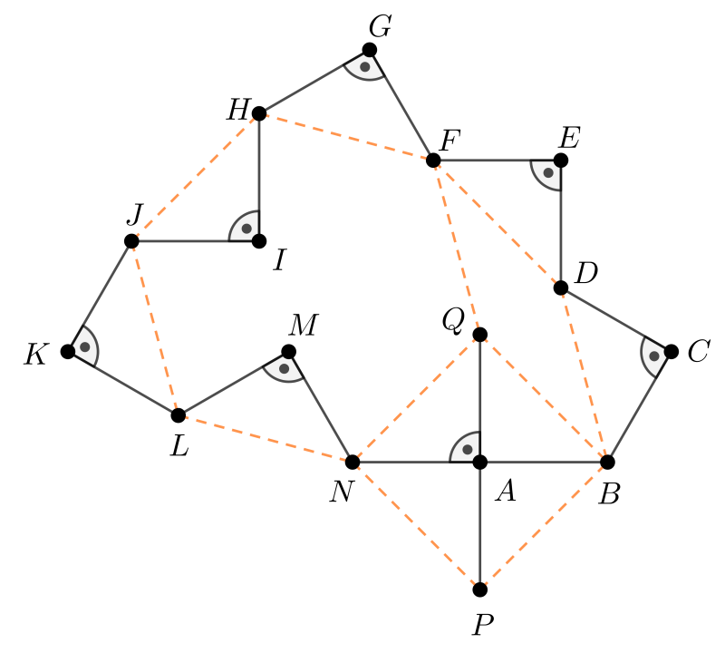b) A teknőc lépéseivel az 1. ábra szerint egy zárt sokszöget járt körbe. A zárt sokszög területének kiszámításához átalakítjuk az előző ábrát: a sokszögből levágjuk a \(\displaystyle BCD\), \(\displaystyle DEF\), \(\displaystyle FGH\), \(\displaystyle JKL\) egyenlő szárú derékszögű háromszögeket és azok közül kettőt a \(\displaystyle HIJ\), \(\displaystyle LMN\) egyenlő szárú derékszögű háromszögek helyére illesztünk, a maradék kettőt pedig befogóikkal az \(\displaystyle NA\), illetve \(\displaystyle AB\) szakaszokra, úgy, hogy az így létrejövő \(\displaystyle P\) pont a zárt sokszög külső pontja legyen. Végül a \(\displaystyle P\) pontot \(\displaystyle NB\)-re tükrözve a \(\displaystyle Q\) pontot kapjuk.