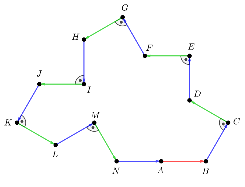 Megoldás. Az a) feladatrész megoldásához ábrát készítünk. Ezen legyen a teknőc útvonalának kezdőpontja \(\displaystyle A\), az útvonal további pontjait jelöljük rendre a \(\displaystyle B\), \(\displaystyle C\), \(\displaystyle D\), \(\displaystyle E\), \(\displaystyle F\), \(\displaystyle G\), \(\displaystyle H\), \(\displaystyle I\), \(\displaystyle J\), \(\displaystyle K\), \(\displaystyle L\), \(\displaystyle M\), \(\displaystyle N\) betűkkel, a teknőc egy-egy lépését pedig egy-egy megfelelő egységvektorral. Az óramutató járásával ellentétes irányú (balra történő) elfordulások szögeit pozitív előjellel ellátva az óramutató járásával megegyező (jobbra történő) elfordulások szöge negatív lesz.