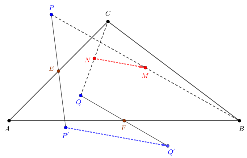 | \(\displaystyle (4)\) | \(\displaystyle \displaystyle{\overrightarrow{P'Q'}\big(b_1-c_1+p_1-q_1; b_2-c_2+p_2-q_2\big),\qquad \overrightarrow{NM}\Big(\frac{b_1-c_1+p_1-q_1}{2}; \frac{b_2-c_2+p_2-q_2}{2}\Big)}.\) |