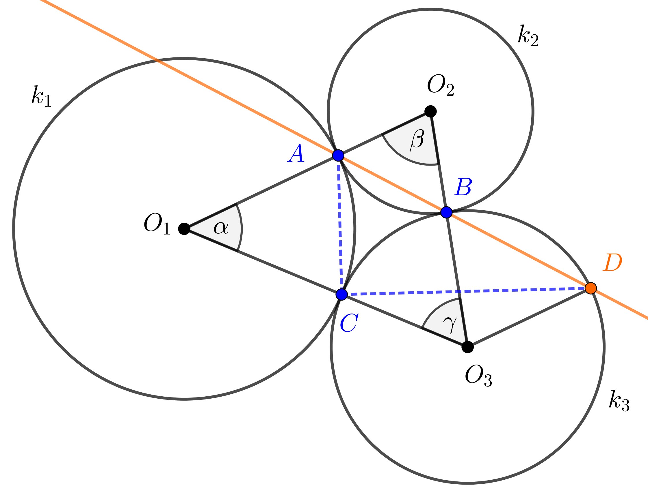 Megolds. Legyenek a \(\displaystyle k_1\), \(\displaystyle k_2\), \(\displaystyle k_3\) körök középpontjai rendre \(\displaystyle O_1\), \(\displaystyle O_2\), \(\displaystyle O_3\). A feltételek alapján könnyen belátható, hogy az \(\displaystyle O_1, O_2, O_3\) pontok egy nem elfajuló háromszög csúcsai. Jelöljük az \(\displaystyle O_1O_2O_3\) háromszög belső szögeit rendre \(\displaystyle \alpha, \beta, \gamma\)-val.