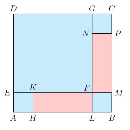 C. 1799. Az egységnyi oldalú \(\displaystyle ABCD\) négyzetben megrajzoltuk a \(\displaystyle DEFG\), \(\displaystyle AHKE\), \(\displaystyle BMFL\) és \(\displaystyle CGNP\) négyzeteket az ábra szerint.