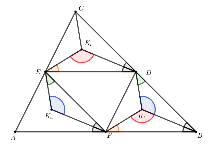 C. 1804. Az \(\displaystyle ABC\) háromszög \(\displaystyle BC\), \(\displaystyle CA\), \(\displaystyle AB\) oldalainak felezőpontja rendre \(\displaystyle D\), \(\displaystyle E\), \(\displaystyle F\). Az \(\displaystyle AFE\), \(\displaystyle BDF\), \(\displaystyle CED\) háromszögek beírt köreinek középpontja rendre \(\displaystyle K_a\), \(\displaystyle K_b\), \(\displaystyle K_c\). Bizonyítsuk be, hogy a \(\displaystyle K_aFDE\), \(\displaystyle K_bDEF\) és \(\displaystyle K_cEFD\) négyszögek területének összege az \(\displaystyle ABC\) háromszög területével egyenlő.