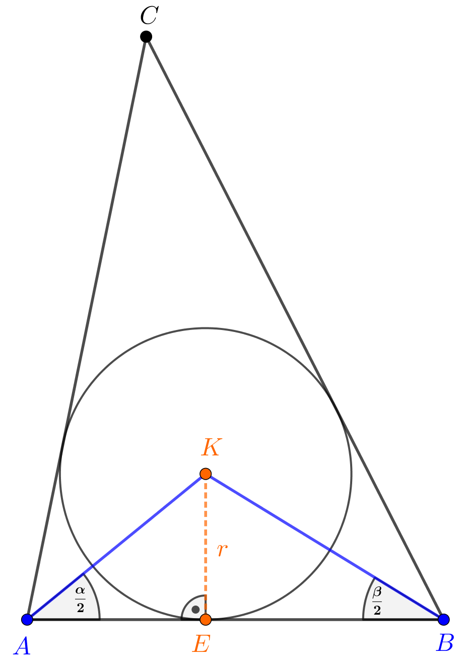 Legyen a feltételeknek megfelelő \(\displaystyle ABC\) háromszög \(\displaystyle r\) sugarú beírt körének középpontja \(\displaystyle K\), a beírt körnek az \(\displaystyle AB\) oldalon levő érintési pontja \(\displaystyle E\).