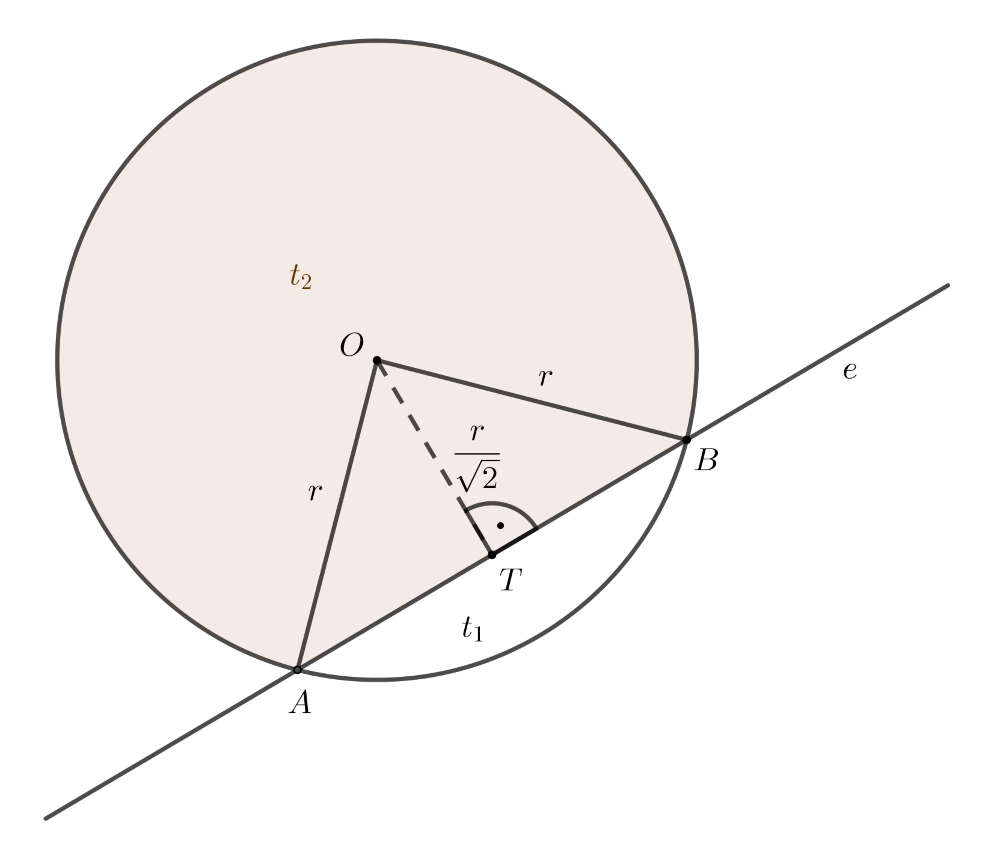 A középpontból a húrra bocsátott merőleges felezi a húrt, ezért az \(\displaystyle AB\) felezőpontja \(\displaystyle T\). Az \(\displaystyle OTB\) háromszög derékszögű, egyik befogója \(\displaystyle \displaystyle{\frac{r}{\sqrt{2}}}\), átfogója \(\displaystyle r\). Erre felírva a Pitagorasz-tételt, azt kapjuk, hogy \(\displaystyle \displaystyle{r^2-\frac{r^2}{2}=TB^2}\), vagyis \(\displaystyle \displaystyle{\frac{r^2}{2}=TB^2}\), tehát \(\displaystyle \displaystyle{TB=\frac{r}{\sqrt{2}}}\). Ez azt jelenti, hogy \(\displaystyle OT=TB\), vagyis az \(\displaystyle OTB\) egyenlő szárú és derékszögű háromszög, így \(\displaystyle TOB\sphericalangle=45^{\circ}\). Az \(\displaystyle OTB\cong OTA\), így \(\displaystyle TOA \sphericalangle=45^{\circ}\), ebből következően \(\displaystyle AOB \sphericalangle =90^{\circ}\). Így az \(\displaystyle A\) és a \(\displaystyle B\) pontok által meghatározott két körcikk területe a kör területének \(\displaystyle \displaystyle{\frac{1}{4}}\)-e, illetve \(\displaystyle \displaystyle{\frac{3}{4}}\)-e.
