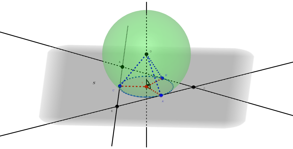 Tekintsük a következő ábrát, amelyen a gömb \(\displaystyle O\) középpontjából a háromszög \(\displaystyle S\) síkjára bocsátott merőleges talppontját \(\displaystyle T\)-vel jelöltük.
