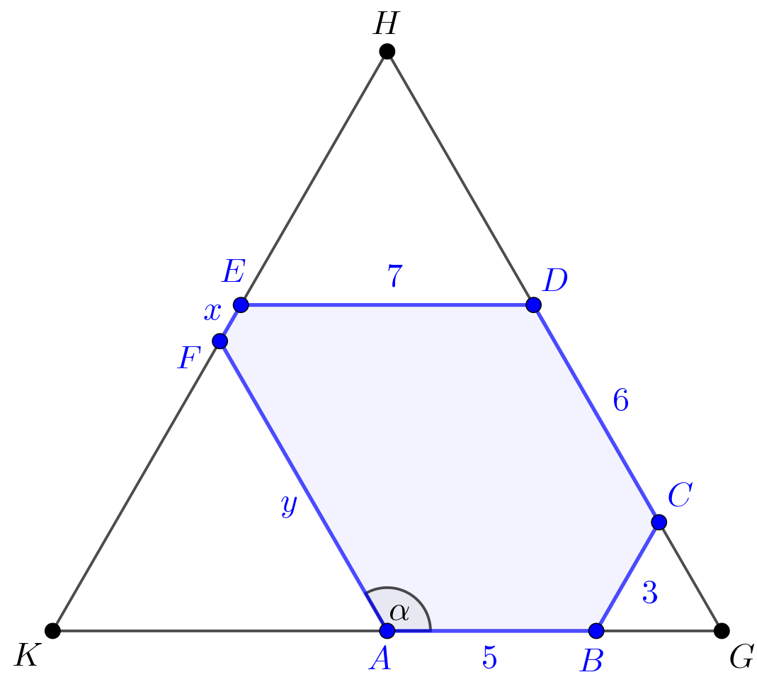 Megoldás. Legyen az \(\displaystyle ABCDEF\) hatszögben \(\displaystyle AB=5\), \(\displaystyle BC=3\), \(\displaystyle CD=6\), \(\displaystyle DE=7\) és \(\displaystyle EF=x\), \(\displaystyle FA=y\). A hatszög pontosan négy háromszögre bontható, így belső szögeinek összege \(\displaystyle 4\cdot 180^{\circ}=720^{\circ}\).