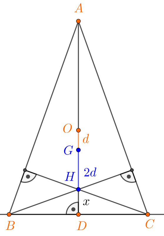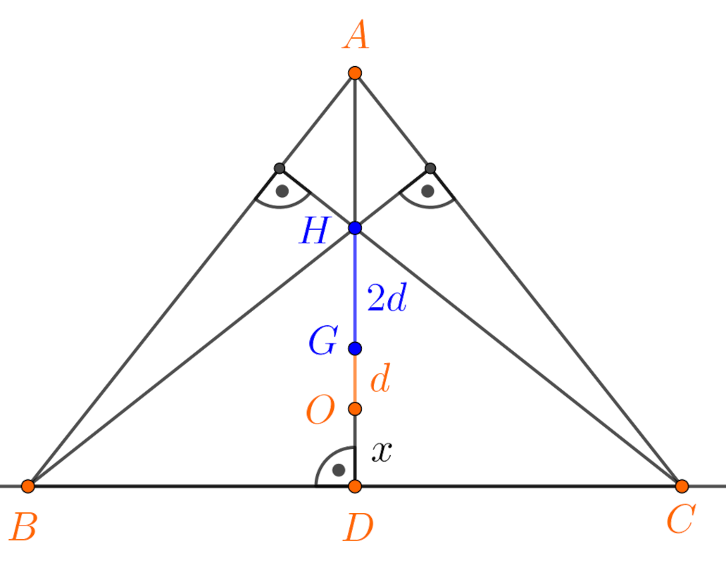 Az \(\displaystyle AB=AC\) egyenlőség miatt a \(\displaystyle H\), \(\displaystyle G\), \(\displaystyle O\) pontok mindegyike rajta van a \(\displaystyle BC\) szakasz felezőmerőlegesén. Jelöljük a \(\displaystyle H\) és \(\displaystyle G\) pontok távolságát \(\displaystyle 2d\)-vel. Ismert, hogy a \(\displaystyle G\) súlypont a \(\displaystyle HO\) szakasznak az \(\displaystyle O\)-hoz közelebb eső harmadolópontja, azaz
