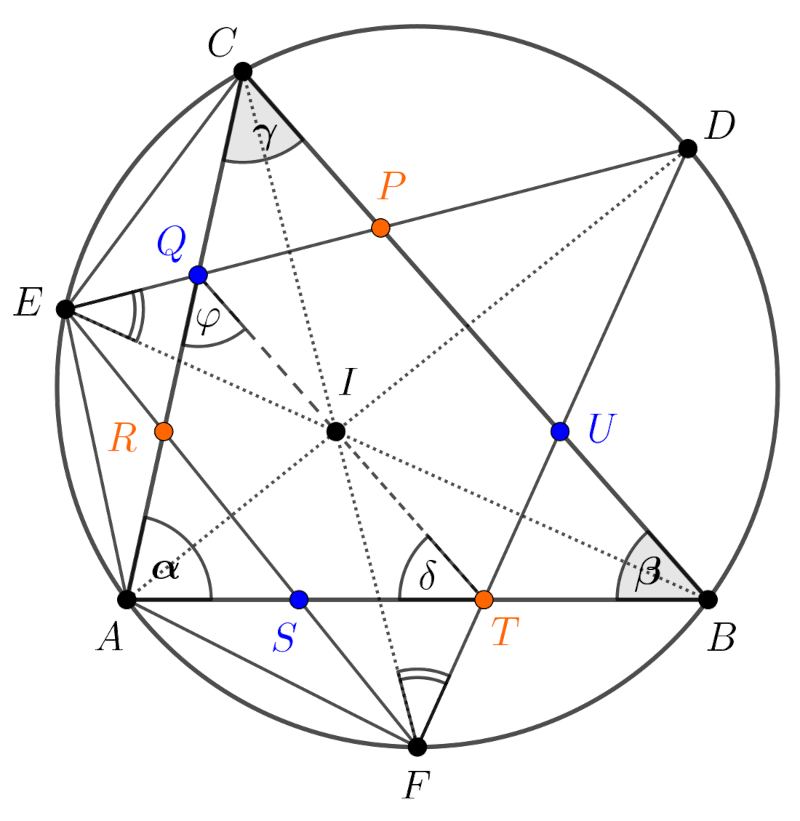 Az (1) összefüggés azt jelenti, hogy a \(\displaystyle TI\) egyenes ugyanazon oldalán fekvő \(\displaystyle A\) és \(\displaystyle F\) pontból a \(\displaystyle TI\) szakasz \(\displaystyle \displaystyle{\frac{\alpha}{2}}\) nagyságú szögben látszik, tehát \(\displaystyle AFTI\) húrnégyszög, illetve a \(\displaystyle QI\) egyenes azonos oldalán levő \(\displaystyle A\) és \(\displaystyle E\) pontból a \(\displaystyle QI\) szakasz is \(\displaystyle \displaystyle{\frac{\alpha}{2}}\) szögben látszik, emiatt \(\displaystyle AIQE\) szintén húrnégyszög.