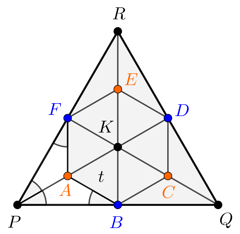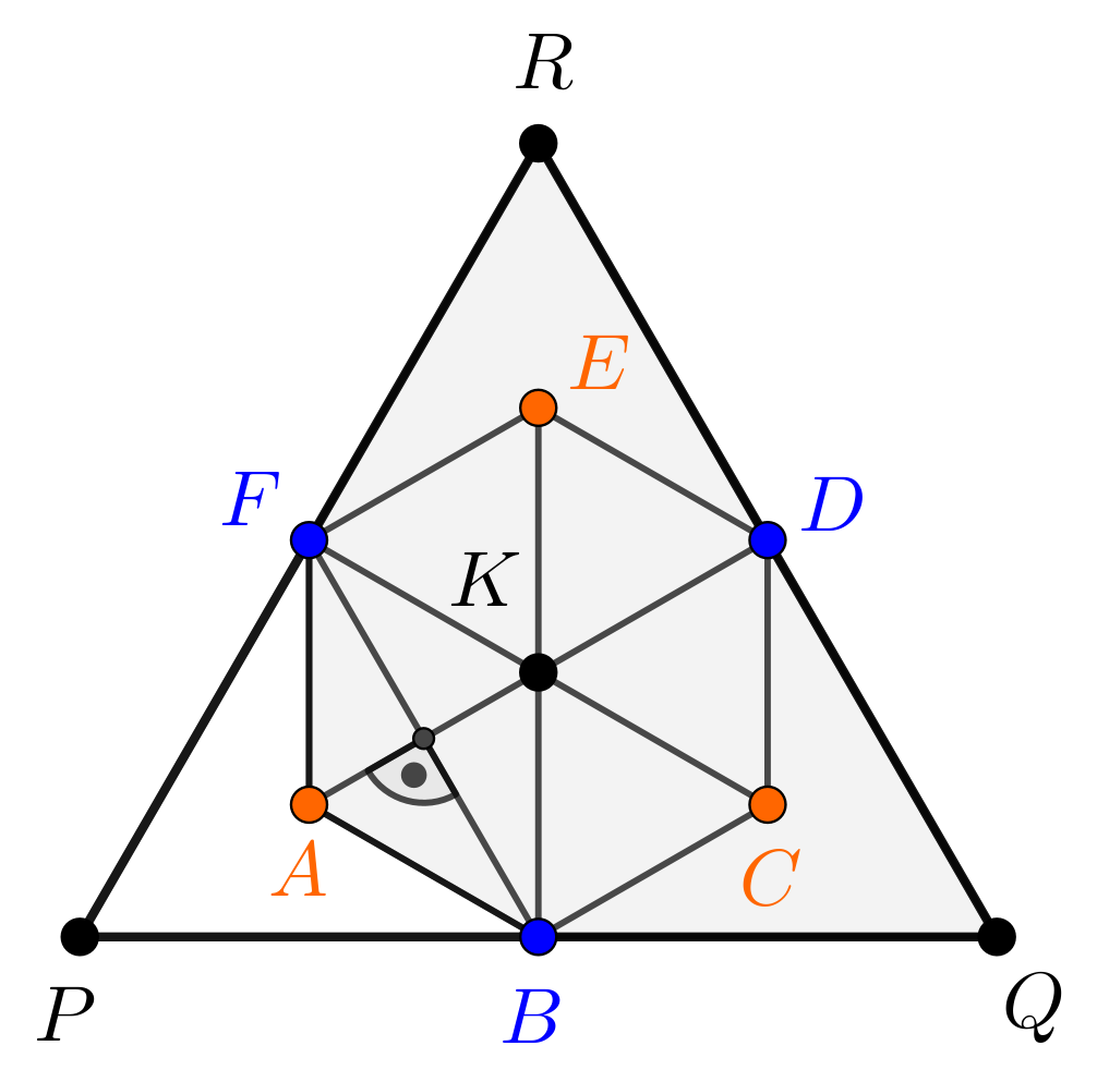 Az \(\displaystyle FPA\) és \(\displaystyle PBA\) tehát egyenlő szárú háromszögek, amelyekre \(\displaystyle AP=AF=AB\) és ezen szakaszok hossza az \(\displaystyle AK\) szakasz hosszával is egyenlő. Ezzel beláttuk, hogy az \(\displaystyle A\) a \(\displaystyle PK\) szakasz felezőpontja, másrészt, hogy \(\displaystyle K\) valóban súlypontja a \(\displaystyle PQR\) szabályos háromszögnek, hiszen \(\displaystyle K\) a \(\displaystyle PD\) súlyvonalnak a \(\displaystyle P\) csúcstól távolabbi harmadolópontja. Hasonlóan egyszerűen igazolhatjuk, hogy a \(\displaystyle C\), illetve \(\displaystyle E\) a \(\displaystyle QK\), illetve \(\displaystyle RK\) szakasz felezőpontja.