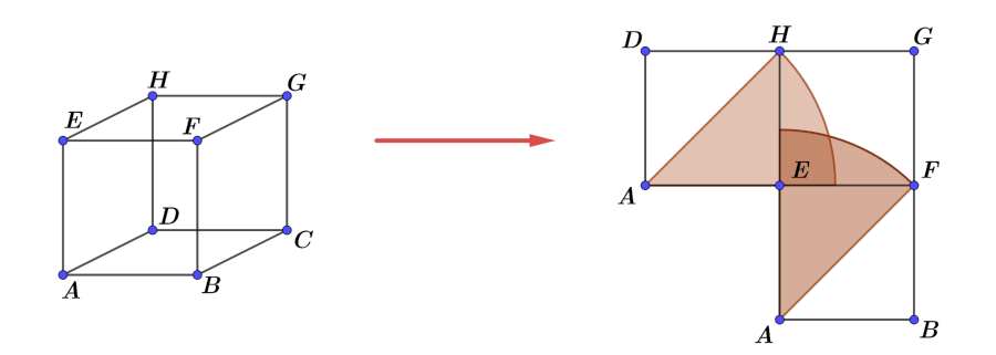 A kockaháló alkalmazásával a kocka felületén az \(\displaystyle A\) csúcstól legfeljebb \(\displaystyle \sqrt 2\) távolságra lévő pontok problémáját síkbeli kérdésre vezetjük vissza. Elmondható, hogy az \(\displaystyle EFGH\) lap azon pontjai, melyek az \(\displaystyle A\) csúcsból az \(\displaystyle AEHG\) lapon keresztül legfeljebb \(\displaystyle \sqrt 2\) hosszú úton elérhetőek, egy \(\displaystyle A\) középpontú \(\displaystyle \sqrt 2\) sugarú körcikk pontjai, és ugyanez igaz az \(\displaystyle ABFE\) lapon keresztül legfeljebb \(\displaystyle \sqrt 2\) hosszú úton elérhető pontokra is. A feladatunk a továbbiakban az, hogy a körcikkek uniójának \(\displaystyle EFGH\) lappal közös részének területét meghatározzuk.