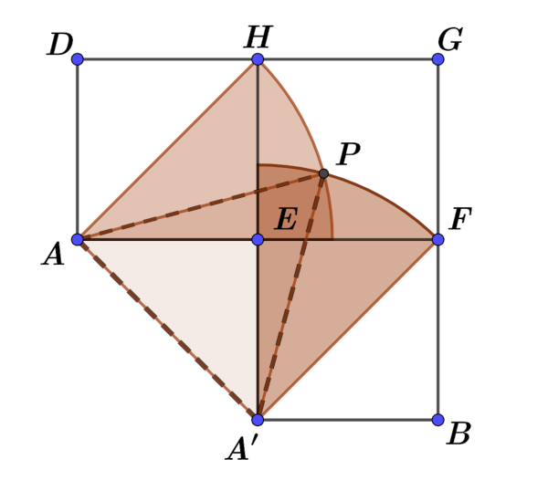 A keresett \(\displaystyle EFPH\) síkidom területét úgy célszerű kiszámolni, hogy \(\displaystyle AA'FPH\) síkidom területéből levonjuk az \(\displaystyle AEH\Delta\), \(\displaystyle A'EA\Delta\), \(\displaystyle \ A'FE\Delta\) háromszögek területét, ez utóbbi háromszögek területe egyaránt \(\displaystyle \frac{1}{2} \ km^2 \). Bontsuk fel az \(\displaystyle AA'FPH\) síkidom területét két körcikkre és egy háromszögre az ábrán látható módon. Vegyük észre, hogy \(\displaystyle AP\) és \(\displaystyle A'P\) is egy-egy sugár, emiatt hosszuk \(\displaystyle \sqrt 2\), ugyanúgy, ahogy az \(\displaystyle AA'\) négyzetátlónak is. Tehát az \(\displaystyle AA'P\) háromszög szabályos. Mivel egy szabályos háromszög magassága az oldalának \(\displaystyle \frac{\sqrt 3}{2}\)-szerese, az \(\displaystyle AA'P\) háromszögnek a területe \(\displaystyle t_\triangle=\frac{\sqrt{2}\cdot \sqrt{2}\cdot \frac{\sqrt 3}{2}}{2}=\frac{\sqrt 3}{2} \text{ km}^2\).
