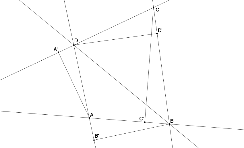 Az A pont pedig a C'B és a B'D egyenesekre illeszkedik, tehát e két egyenes metszéspontjaként kapjuk meg.