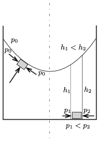 Ugyanerre az eredményre jutunk, ha a folyadék felszínénél lévő vízdarabkát vizsgáljuk. Ott a felület érintősíkja mentén elhelyezkedő szomszédos vízrészek nyomása ugyanakkora (a légköri nyomással megegyező), ezek eredő erőhatása a szimmetria miatt nulla. Az érintősíkra merőlegesen (,,alul'') található darabka nyomóerejének viszont lehet a tengely irányába mutató, vízszintes komponense, de csak akkor, ha a felület nem sík, hanem felülről nézve homorú. (A vízdarabka alatt lévő víz nyomásából származó erő függőleges komponense a vízdarabkára ható nehézségi erővel tart egyensúlyt.)
