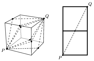 G. 648. Egy kis bogár indul el egy 10 cm oldalélű fakocka \(\displaystyle P\) csúcsából. Legalább mennyi időre van szüksége a bogárnak ahhoz, hogy elérjen a kocka legtávolabbi \(\displaystyle Q\) csúcsához, ha a bogár sebessége 1 cm/s? Hányféle úton mozoghat a bogár, hogy a legrövidebb idő alatt odaérjen?