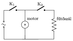 G. 656. Egy régi hajszárítónak két kapcsolója van. Ha az első kapcsolót zárjuk, akkor hideg levegőt fúj a hajszárító. Meleg levegővel akkor száríthatunk hajat, ha a második kapcsolót is bekapcsoljuk. Ha csak a második kapcsolót zárjuk, akkor sem a ventillátor, sem a fűtőszál nem működik. Készítsük el a hajszárító kapcsolási rajzát!