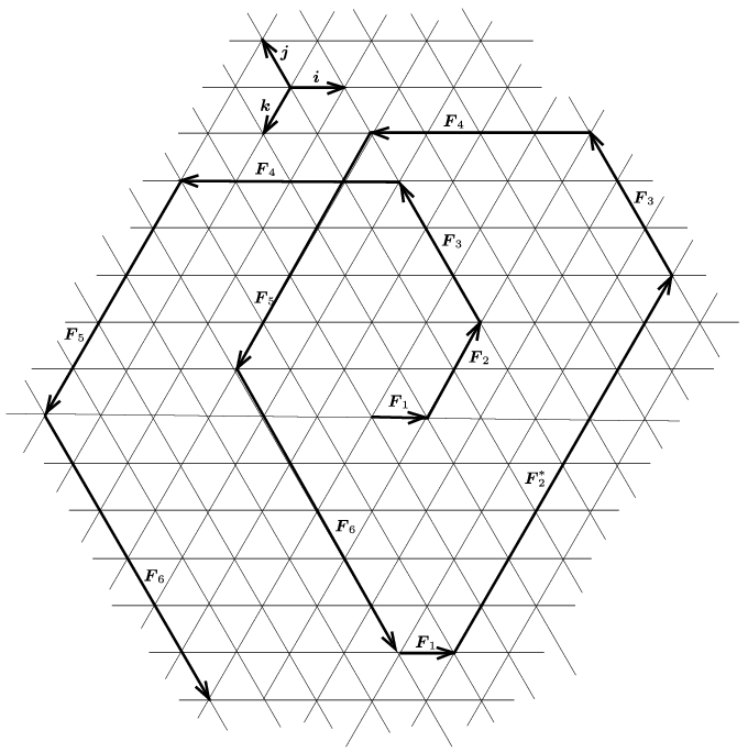 Megoldás. Tekintsük egy egységnyi oldalélű szabályos háromszög oldalait vektoroknak, és jelöljük ezeket a vektorokat \(\displaystyle \boldsymbol i\)-vel, \(\displaystyle \boldsymbol j\)-vel és \(\displaystyle \boldsymbol k\)-val, ahogy azt az 1. ábra mutatja. Nyilván fennáll, hogy \(\displaystyle \boldsymbol i+\boldsymbol j+\boldsymbol k=\boldsymbol 0\), vagyis