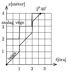 5. állapot: A csiga \(\displaystyle 4-\tfrac{10}3=\tfrac23\) méternyi utat \(\displaystyle \tfrac23\) óra, vagyis 40 perc alatt tesz meg, tehát az indulástól számítva \(\displaystyle 2^{\rm h}40'\) alatt érkezik a szalag végéhez. A csiga helyzetét és a szalag végének helyét az idő függvényében az alábbi ábra mutatja.