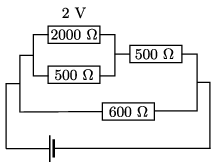 \(\displaystyle b)\) Az Ohm-törvény szerint a 2000 ohmos ellenálláson 1 mA áram folyik, a vele párhuzamos 500 ohmoson pedig 4 mA. A másik 500 ohmos ellenálláson összesen 5 mA áram folyik át, rajta eső feszöltség tehát 2,5 V. A telep feszültsége \(\displaystyle 2~{\rm V}+2{,}5~{\rm V}=4{,}5~{\rm V},\) és a 600 ohmos ellenálláson 7,5 mA folyik át.