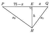 Jelöljük a földrengés helyén átmenő függőleges sík és a megfigyelőállomások távolságát \(\displaystyle x\)-szel és (\(\displaystyle 75-x\))-szel! Legyen továbbá ezen függőleges sík földfelszíni \(\displaystyle E\) pontjának (a rengés epicentrumának) és a \(\displaystyle H\) rengésfészeknek (hipocentrumnak) a távolsága \(\displaystyle h\).