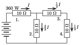 Megoldás. Számozzuk meg az ellenállásokat az ábrán látható módon. Az 1. ellenálláson folyik át a legnagyobb áram (hiszen az az 1. ellenállás után két részre oszlik), tehát az egyforma ellenállások közül az 1.-re jut a legnagyobb teljesítmény.