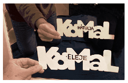 Megoldás. Tükörírással. Ha meg akarjuk nézni a KöMaL felirat hátulját, meg kell fordítanunk (pl. a függőleges tengely körül) a feliratot. Eközben a Hátulja szó ,,H'' betűje a szöveg jobb szélére, a szóvégi ,,A'' betű pedig a szöveg elejére (bal szélére) kerül.