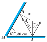 G. 795. Két síktükör egymással \(\displaystyle 60^\circ\)-os szöget zár be. A két tükör metszésvonalától 30 cm-re \(\displaystyle 30^\circ\)-os beesési szögben fénysugár érkezik az egyik tükörre. Legalább mennyi idő telik el, amíg a visszaverődő fény az egyik tükörről a másikig ér?