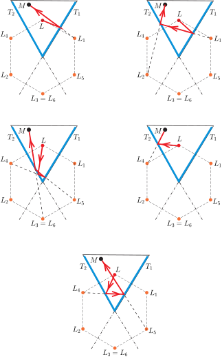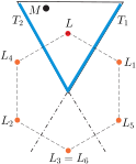 Az \(\displaystyle L_1, L_2, L_3, L_4\) és \(\displaystyle L_5\) pontok egy szabályos hatszög csúcsaiban helyezkednek el (3. ábra). Az \(\displaystyle M\) megfigyelő ezen pontok mindegyikében láthatja az \(\displaystyle L\) lámpa virtuális képét, tehát összesen 5 tükörkép keletkezik. Ha az \(\displaystyle M\) megfigyelő a szoba bal oldali felében helyezkedik el (a 4. ábra egy ilyen elrendezést mutat), akkor a \(\displaystyle T_1\) tükörben 2 tükörképet, a \(\displaystyle T_2\) tükörben pedig 3 képet fog látni. Ha \(\displaystyle M\) a szoba másik felében tartózkodik, akkor a helyzet megfordul, de ilyenkor is összesen 5 képet láthat.
