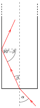 A palásthoz tartozó \(\displaystyle 90^{\circ}-\beta\) beesési szög akkor kicsi, ha az alaplapon a \(\displaystyle \beta\) törési szög nagy. A legnagyobb \(\displaystyle \beta\) törési szöghöz az alaplapon \(\displaystyle 90^{\circ}\)-os beesési szög tartozik (ez valójában csak elvi határ, mert \(\displaystyle 90^{\circ}\)-os beesési szög esetén a megtört nyaláb intenzitása nulla). Határesetben tehát \(\displaystyle \beta\) maximumára ezt írhatjuk fel: \(\displaystyle \sin{\beta_\mathrm{max}}=1/n\).