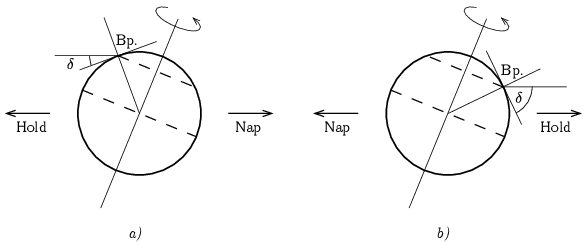 Ez a három megállapítás az alábbi ábrákban foglalható össze. Az a) ábra a Föld helyzetét mutatja egy nyári, a b) pedig egy téli holdtölte esetén, abban az időpontban, amikor a Hold Budapesten (az ábrán Bp.) éppen delel. Ezekből látható, hogy a Hold delelésének a látóhatár feletti magasságát jellemző, az ábrákon \(\displaystyle \delta\)-val jelölt szög télen lényegesen nagyobb, mint nyáron. (A különbséget befolyásolja, hogy a Hold pályasíkja kb. \(\displaystyle 5^\circ\)-kal eltér a ekliptika síkjától, így a Hold, a Föld és a Nap holdtöltekor sem esnek teljesen egy egyenesbe, van egy \(\displaystyle 5^{\circ}\)-nál nem nagyobb ,,törés'' a Hold-Föld-Nap tengelyben, de ez nem változtat azon, hogy Budapesten télen, a napfordulóhoz közel a telehold határozottan magasabban delel, mint nyáron.)
