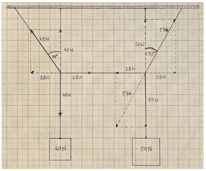A 40 N-os erő függőleges, ezzel \(\displaystyle 35^\circ\)-os szöget zár be a \(\displaystyle T_1\) erő, illetve a \(\displaystyle T_2\) erő vízszintes. A szöget felmérve, majd a 40 N-os erő ellentettjét berajzolva, végül párhuzamosok berajzolásával leolvashatjuk, hogy \(\displaystyle T_1=49\,\mathrm{N}\) és \(\displaystyle T_2=28\,\mathrm{N}\).