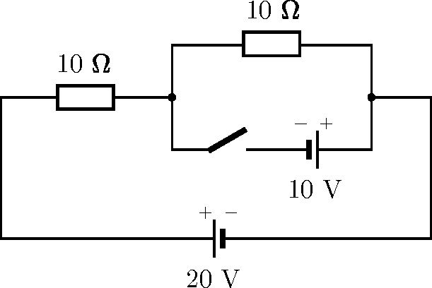 a) Ha a kapcsolót zárjuk, akkor a jobb oldali ellenállásra 10 V feszültség esik, tehát rajta most is 1 A áram folyik, de az előzőekkel ellentétesen, vagyis jobbról balra. A bal oldali ellenállásra 30 V feszültség jut, tehát abban 3 A áram folyik az előzőekkel azonos irányban, balról jobbra. A csomóponti törvény szerint a 10 V-os telepen 4 A áram, míg a 20 V-os telepen 3 A áram folyik.