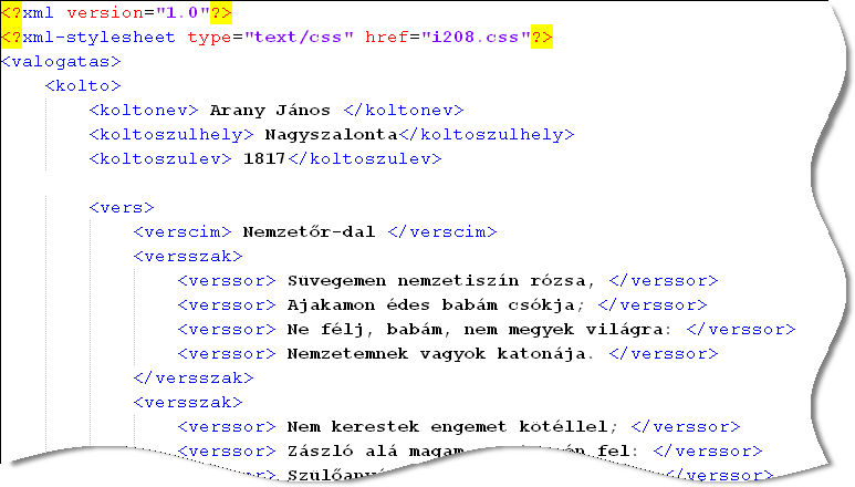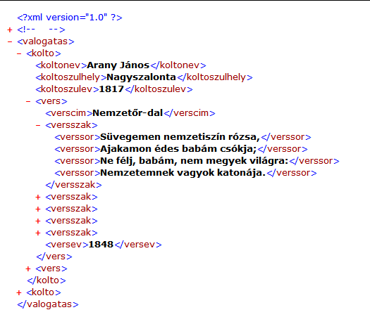 I. 208. Készítsünk XML formátumú versválogatást legalább két költő verseinek felhasználásával. A jólformázott dokumentum költőnként legalább két, több versszakos versből álljon. Az elkészítés során a következő tag-eket használjuk: valogatas, kolto, koltonev, koltoszulev, koltoszulhely, vers, verscim, versszak, verssor, versev.